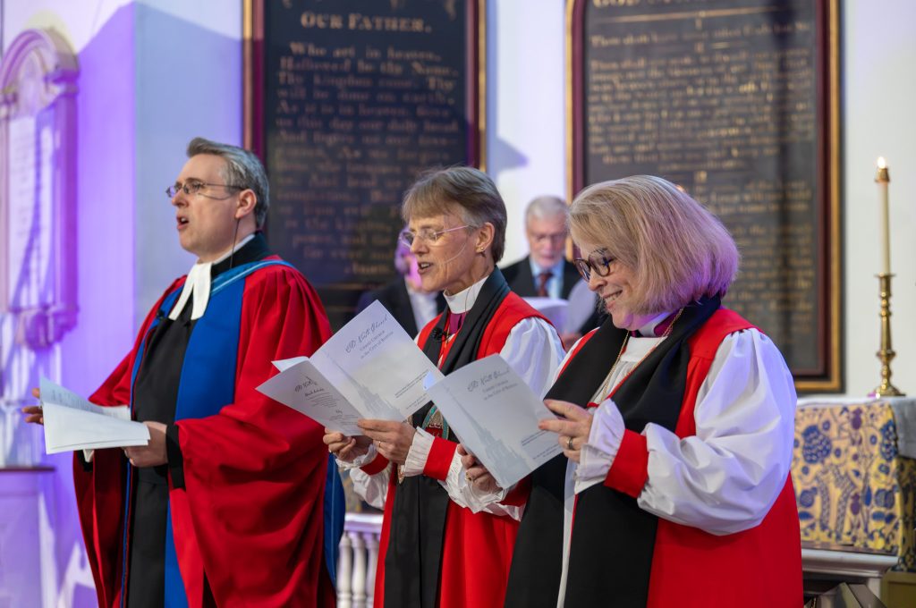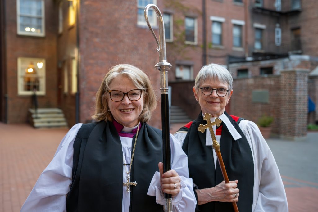 Momentous developments in Episcopal Church history include the election of John Burgess as bishop of Massachusetts in 1970, the first African American to lead a diocese. The first ordinations of women as deacons were held in 1970 and as priests in 1974. The first woman consecrated bishop was Barbara Harris in 1989, also in Massachusetts. Gene Robinson, the first openly gay bishop, was consecrated in 2003. The first woman was elected as Presiding Bishop of the Episcopal Church was Katherine Jefferts Schori in 2006, followed by Michael Curry, the first African American Presiding Bishop, in 2015 (pictured above). Julia E. Whitworth was elected as the Bishop of Massachusetts in 2024, the first woman to lead our diocese (pictured below left, with the Rev. Deacon Daphne Noyes, right).