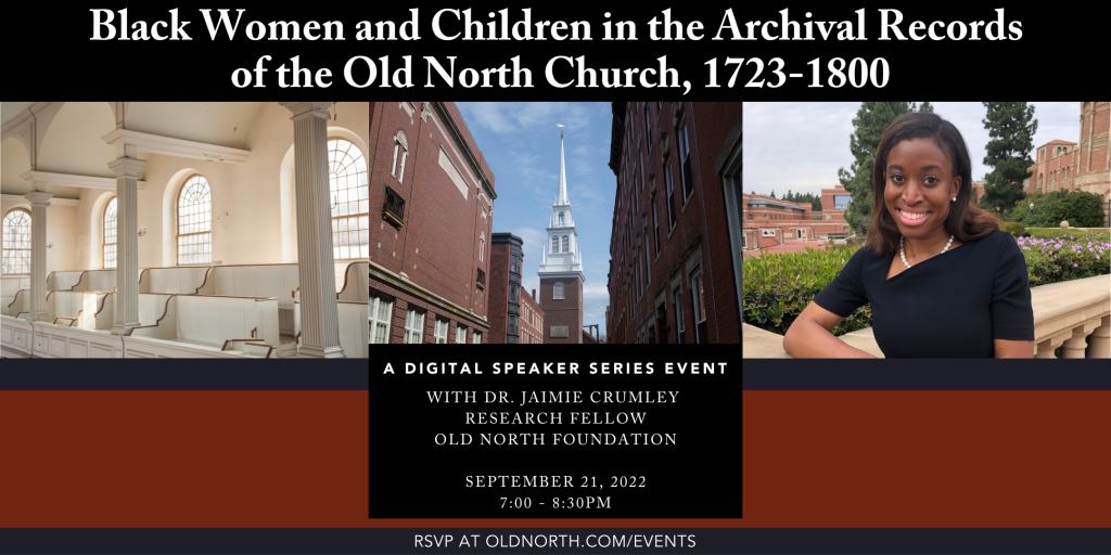 The second version of this research question responds to the historical record’s failure to account for Black women’s and children’s lives. This talk considered the silences about Black women and children in the Old North Church’s archival records and shared some of the Black feminist archival reading methods that allow us to expand the legibility of archival documents. This talk was part one of Dr. Crumley’s two-part series about research methods that allow us to discover Black women’s and children’s stories in the Old North Church’s archives.