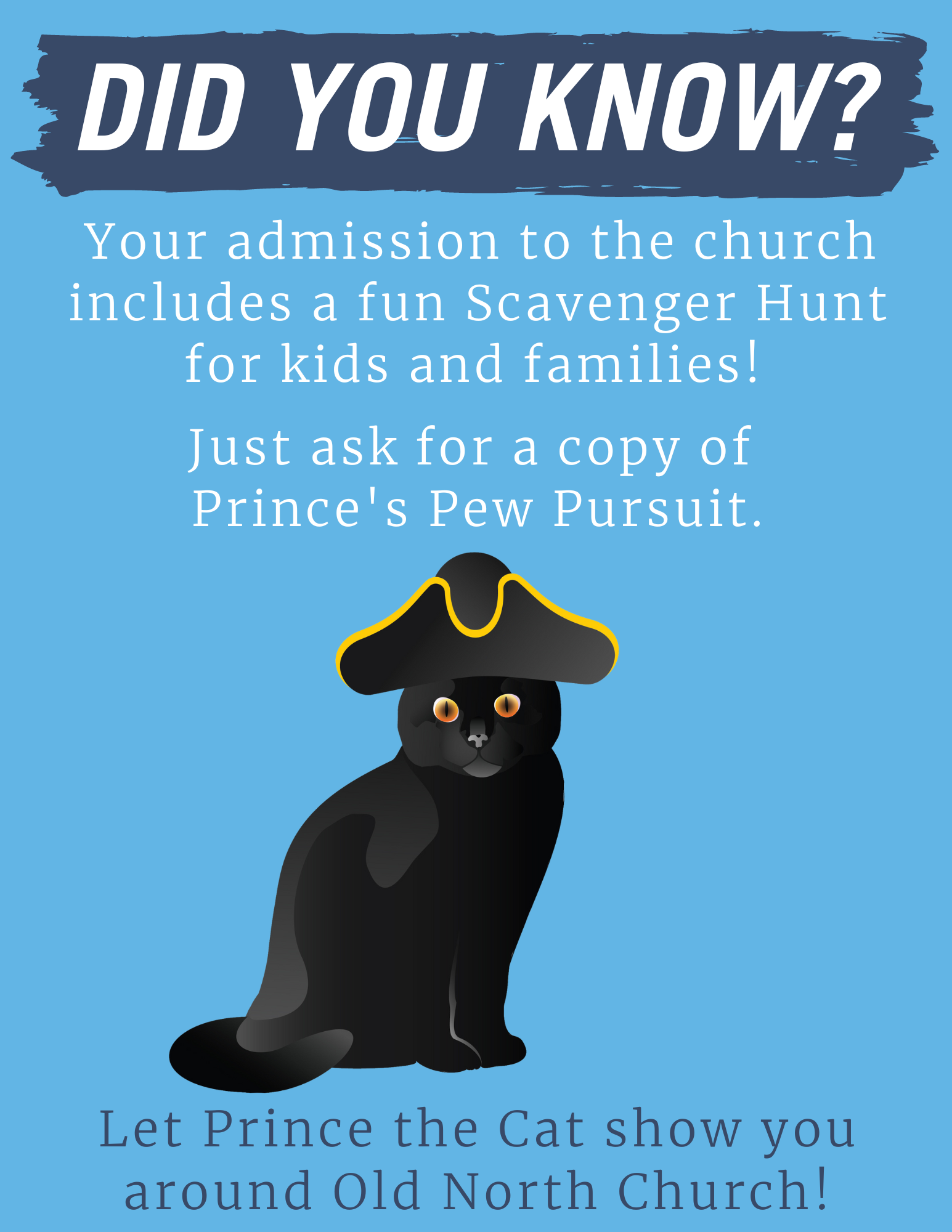 In this fun activity designed especially for families, visitors explore Old North through a scavenger hunt narrated by Prince, the friendly North End cat who used to frequent the church. By finding clues and answering questions, participants will see highlights of the sanctuary and learn about Old North’s unique history.
