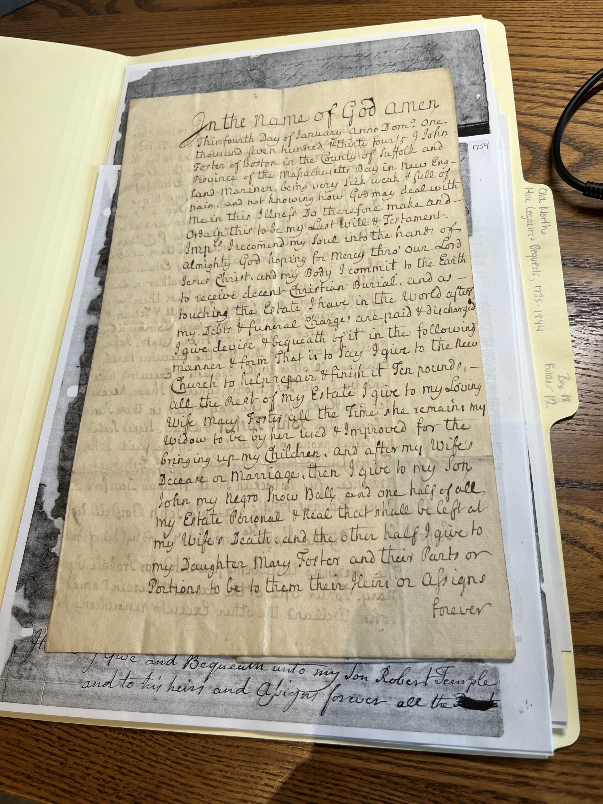 In previous videos in this series, we have seen that enslaved and free Black people attended Old North Church and participated in its rituals. Within the church records, these individuals and families become legible only if they participated in the church’s rituals of baptism, marriage, and burial. Therefore, it is only through legal documents such as wills, tax records, and asset inventories that we can even begin to account for how many enslaved Black people were part of Old North in the British Colonial period. For example, when he died in 1734, John Foster left Old North, which he calls “the new church,” ten pounds to help repair and finish it. However, his will also reveals that he enslaved a person whom he called Snow Ball. He left Snow Ball to his son, John. Of course, the wills of white church members tell us nothing about free Black people.