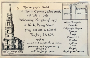 The Women’s Guild was far more than simply a social club for the female members of the Old North congregation. The organization proved to be a prominent source of support for the church in the first half of the twentieth century, whether it was through maintaining the church’s status as a welcoming community space or contributing financially with fundraising events like sales. Yet, the women of the guild sought no recognition for their efforts and did not attempt to disrupt the prevalent gender expectations of the time period—though they also did not allow such expectations to limit their autonomy and ambition. Indeed, they wholeheartedly embraced their place in the domestic realm while simultaneously playing a vital role in the success and historical and cultural significance of the Old North Church.